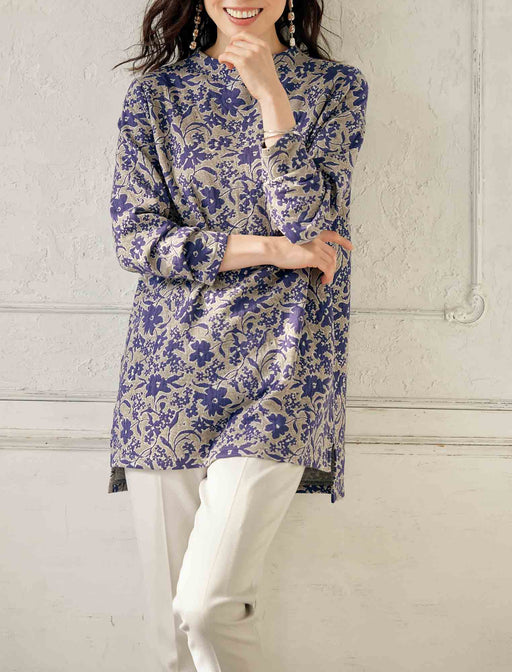 柔らかく落ち着きのあるボタニカル柄が、まるで水彩画のように優しく映えるチュニック丈ブラウス。 肌あたりも滑らかなので、さらっと軽やかに着こなせます。 デニムやワイドパンツと組み合わせて、旬な秋コーデの完成。