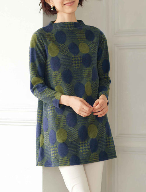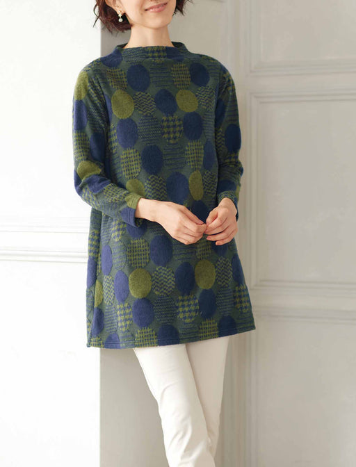 ふんわり起毛に浮かぶ様々なサークル柄。 やわらかなウール混のジャカードカットソーで、ヒップ下まで暖かくカバーできるチュニック丈。 ボーダーやチェックなど色々な模様のサークル柄は、ふわふわの起毛感と相まってやさしい表情。