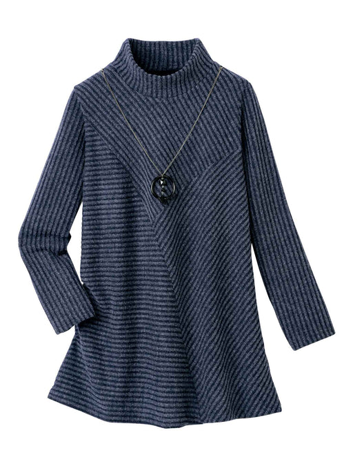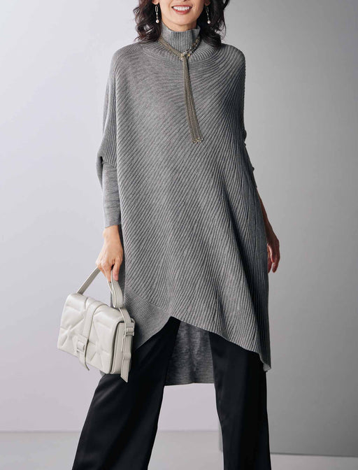 リブ素材を斜めに切替えた、ハイネックチュニックプルオーバー。 デザインを引き立てるお洒落なネックレス付き。 1枚でスタイリングが決まる、手軽さと女性らしさを兼ね備えたアイテム。