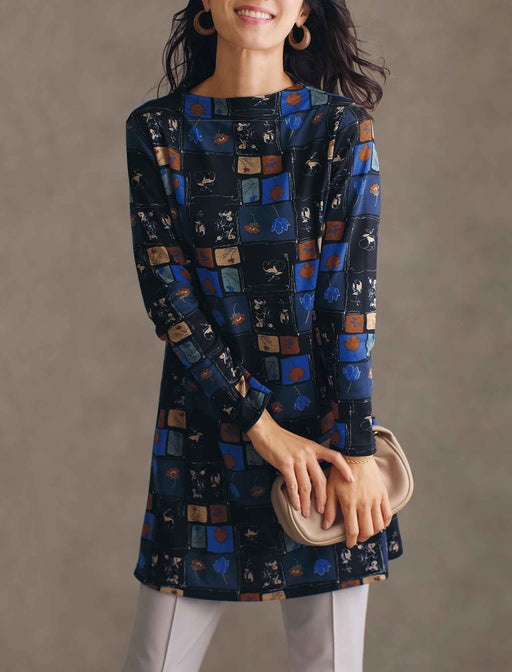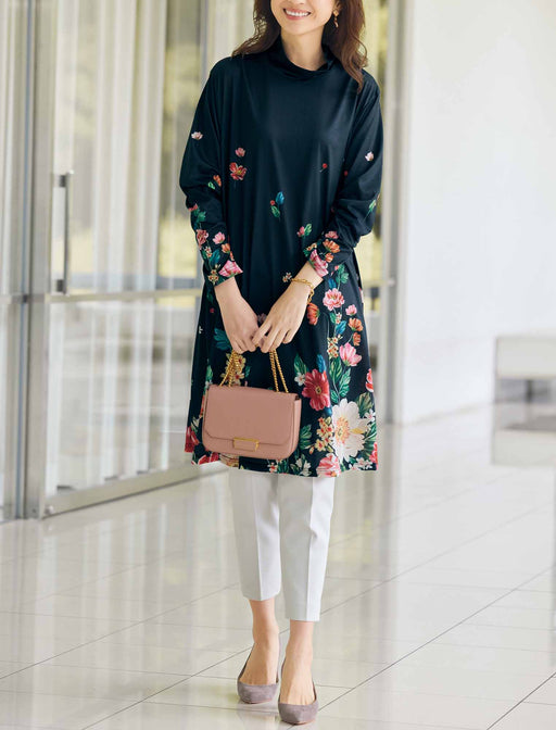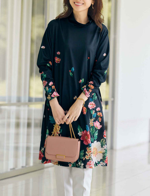 一枚着の季節に活躍するハイネックのチュニック。 遠目からでも目をひく鮮やかなパネルプリントをあしらってエレガントに格上げ。 なめらかで落ち感のある素材もポイントです。