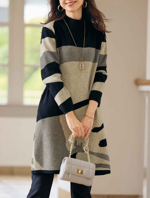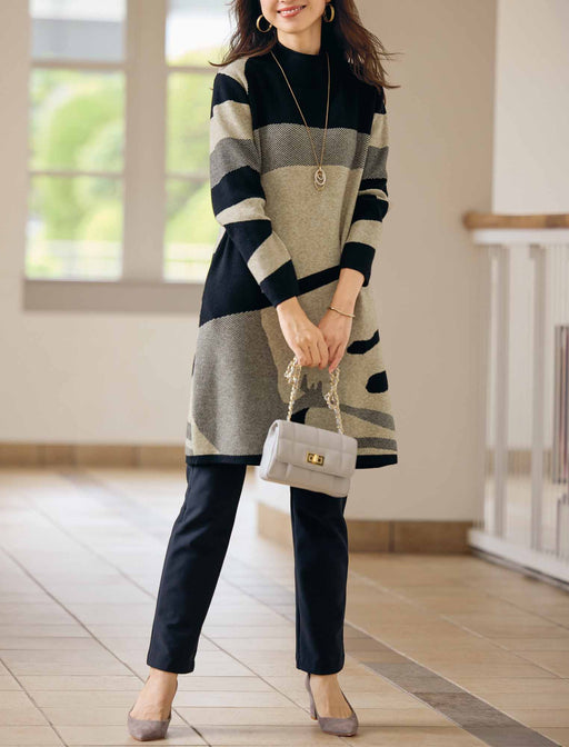 ゆったり着られて、体がきれいに見えるニットチュニック。 体のラインを拾いにくいしっかり肉厚の素材で体型カバーも◎ 黒を絶妙な配分で取り入れたモダンな編み柄が、一枚での洒落見えを叶えてくれます。