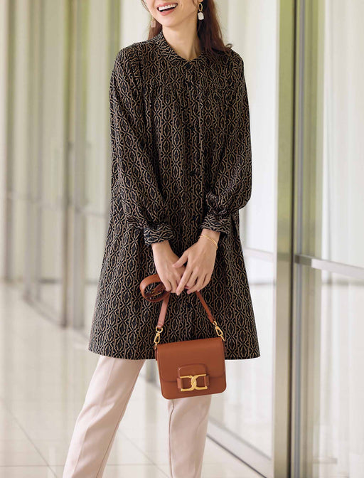 印象的なジオメトリック柄と胸元タックが、着映え効果を発揮。 アルファベットをアレンジした遊び心のある柄と、黒 × ブラウンのシックな配色が、おしゃれ感度の高さを物語るシャツチュニック。 胸元タック入りのゆったりシルエットや、袖の程よいふんわり感も今どきな印象です。