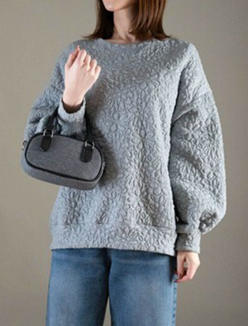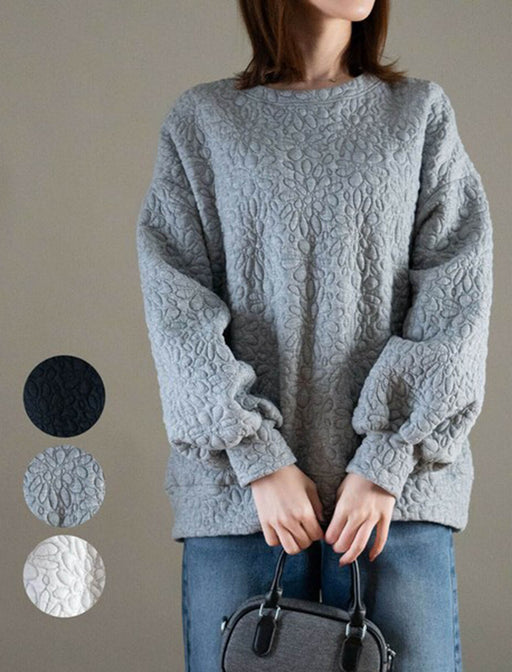 立体的なエンボス加工のフラワー柄が、着るだけで気分を上げてくれる主役級トップス。 シンプルながらもデザイン性が高く、いつものボトムスに合わせるだけで華やかなスタイルが完成します。 おしりが隠れる丈感も、安心してオシャレを楽しめるポイント。