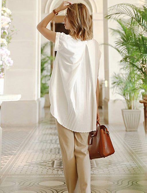 後ろ姿に華やぎを添えるバックプリーツデザインのブラウス。<br>動くたびに揺れるプリーツが、さりげなく女性らしさを演出。<br>前はシンプルに、後ろは印象的に仕上げた一枚です。<br><br> ※お届けする商品は袖の折り返しがあるものになります。