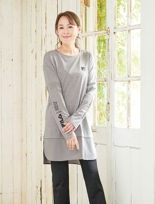 レース風プリントが華やかさを添える、ゆったりシルエットのトップス。<br>体のラインを拾いにくいチュニック丈で、リラックス感のある着心地。<br>一枚で着映えし、デイリーにもお出かけにも活躍します。