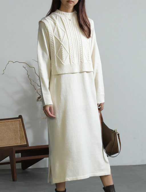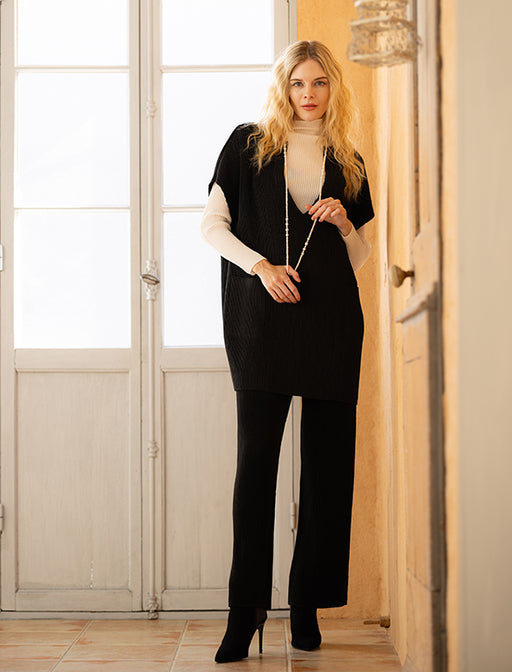 重ね着で始めるお洒落な秋。 カジュアルにもきれいめコーデにも着映えるチュニックベストは、立体感のある端正な編み柄が上品さを演出。 体型カバーも叶えます。