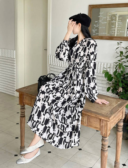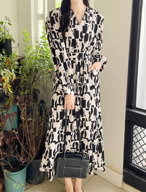 モダンな柄が目を引く七分袖チュニックプルオーバー。<br>衿と袖口に無地を切り替えることで、メリハリのあるデザインに。<br>胸元のピンタックやとろみ素材を生かした広がりのあるシルエットが、女性らしい軽やかさを演出します。