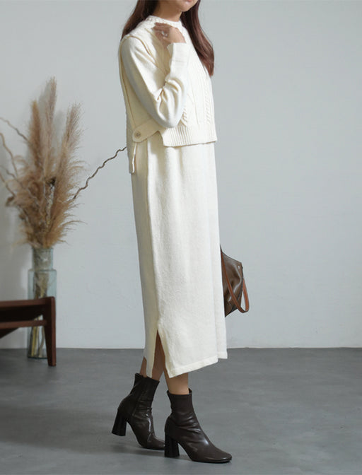 ゆったりと着られ肩先も暖かいニットベスト。 変化のある編み地とサイドスリットのボタンがアクセント。 タートルネックやシャツをレイヤードして大人カジュアルの完成。