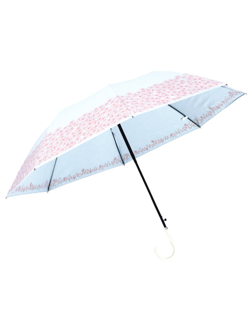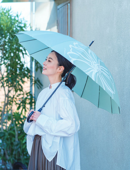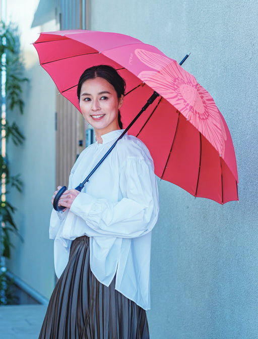 一輪の花が鮮やかなデザイン。丈夫で使いやすいベストバランスのロングセラーアイテム!<br>使いやすさと軽さを追求しながら改良を重ねてきた16本骨ジャンプ傘で、従来品の親骨58cmに比べ約20%軽量化し、UVカット機能もプラスしました◎