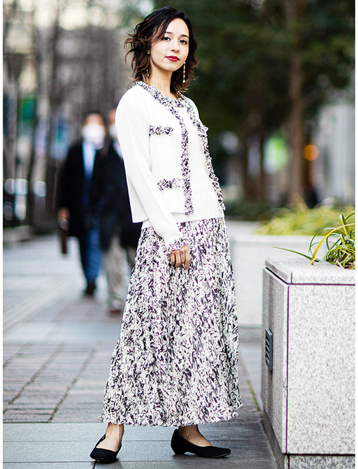 暖かみのある起毛レースが、大人の冬スタイルをエレガントに彩る。 Iラインシルエットに洗練されたパイピングディテールを加え、シンプルながらも高見えするデザインに仕上げました。 ブラウスやきれいめなトップスと合わせれば、オフィスやセミフォーマルなシーンにも対応するエレガントスタイルが完成します。