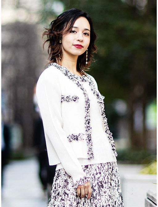 透け感と繊細な刺しゅうが魅せる、上品フェミニンなレイヤードスタイル。 総チュールの素材に小花の刺しゅうを贅沢に施し、透け感と華やかさを絶妙に両立させたデザイン。 ジャケットやカーディガンのインナーにして、ほのかな透け感で堅すぎない上品さをプラス。