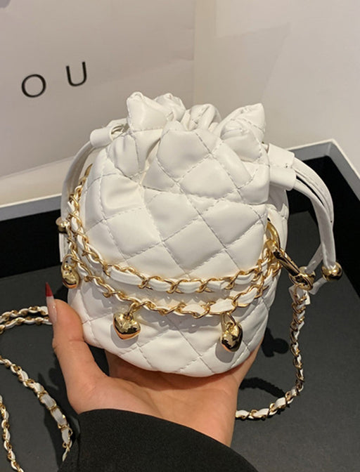 キルティング素材にハートモチーフをあしらった華やかで愛らしい巾着型ショルダー。<br>軽量でコンパクトながら必要なものをしっかり収納でき、使い勝手抜群。<br>ミニサイズながらコーデのアクセントになる華やかさが魅力です。