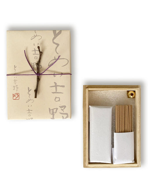 一瞬で過ぎ行く桜の季節をお香の中に閉じ込めました。 パッケージには本物の桜の枝が結ばれていて贈答、ギフトに最適。 真鍮のお香立付きです。