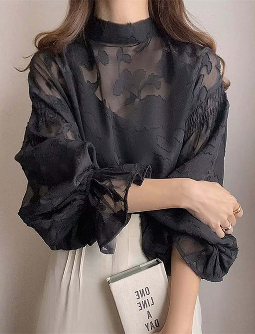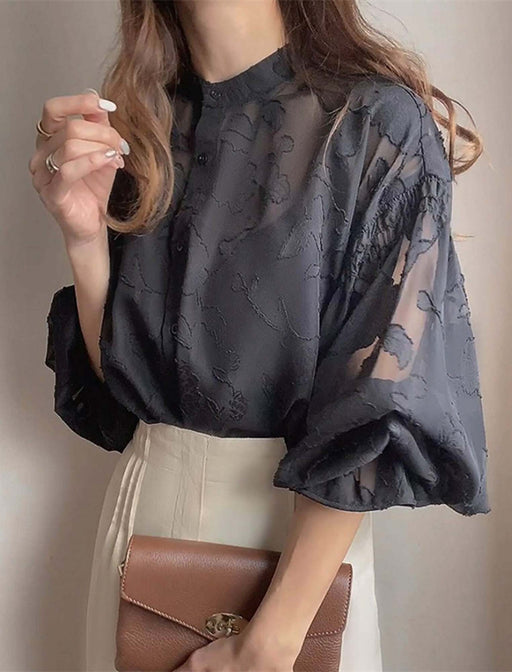 上品な透け感と華やかなシルエットが魅力の一枚。 ふんわりとしたバルーンスリーブが女性らしさを引き立て、程よい透け感が上品な印象を与えます。 カジュアルな会食や食事会など、フォーマルシーンにも幅広く対応します。