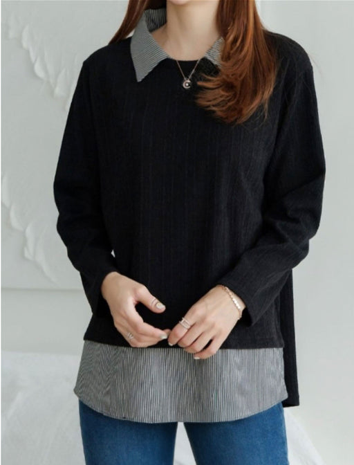 そのまま「重ねる」感覚、シャツ × カットソーの理想形。 シャツの清楚さとカットソーの快適さを掛け合わせ、気負わずおしゃれに見せる一着。 ピンストライプのシャツをレイヤードしたことで、ロング丈でも重く見えず軽やかな印象に。