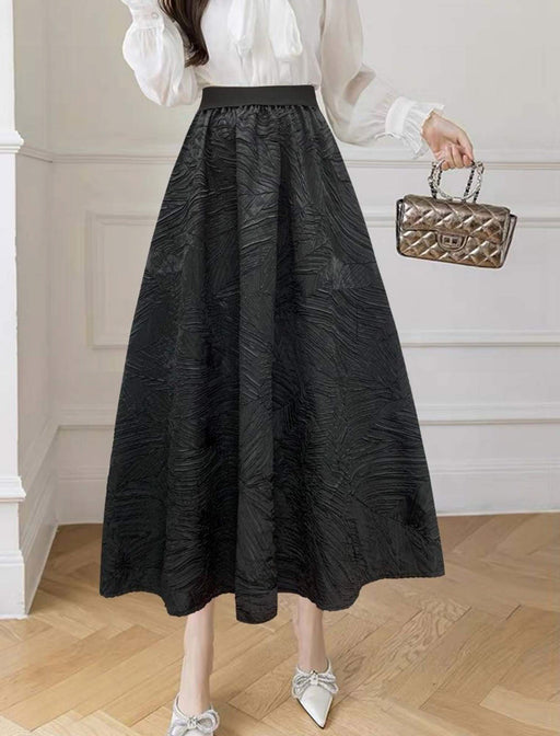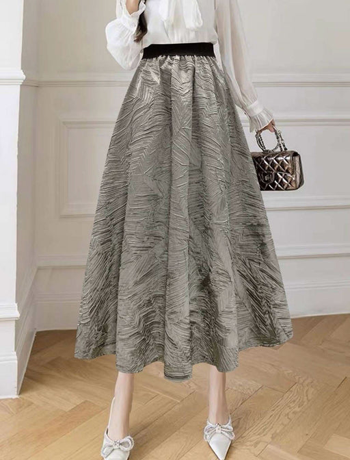 エレガントな光沢と個性的な柄が目を惹く、存在感のあるフレアスカート。 上品な光沢と繊細なジャガード柄が、大人の華やかさと高級感を演出します。 特別なお出かけやパーティーシーンに取り入れるだけで、コーディネートがワンランクアップする主役級アイテム。