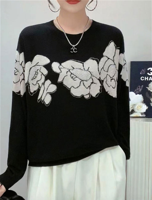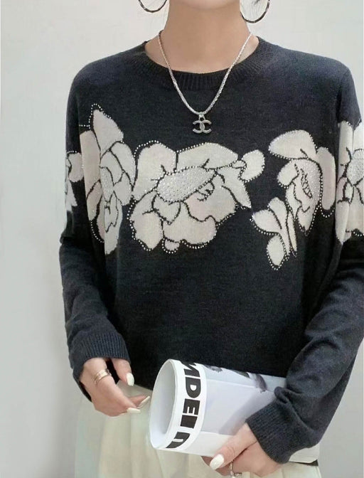 きらめく花柄で魅せる、上品ニットプルオーバー。 いつもの着こなしにパッと華を添える、アートのようなフラワーデザインニット。 胸元にあしらったラインストーンが、さりげなく光を集めて上品な華やかさをプラスします。