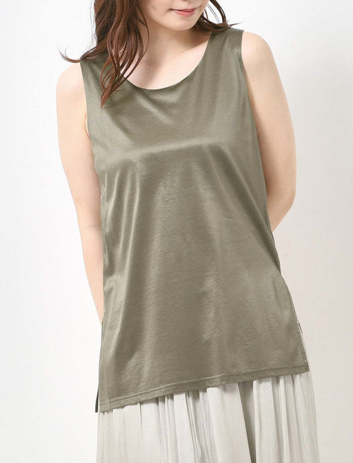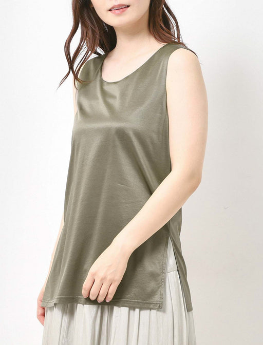 上品な艶のあるサテン素材を使用したタンクトップ。 シンプルながらも存在感を放つ一枚で、肌にさらりと触れる質感と光沢が、特別なシーンまで幅広く活躍します。 サイドにスリットを入れることで、動きにメリハリを持たせつつ、レイヤードも楽しめるデザインに仕上げました。