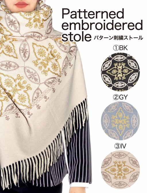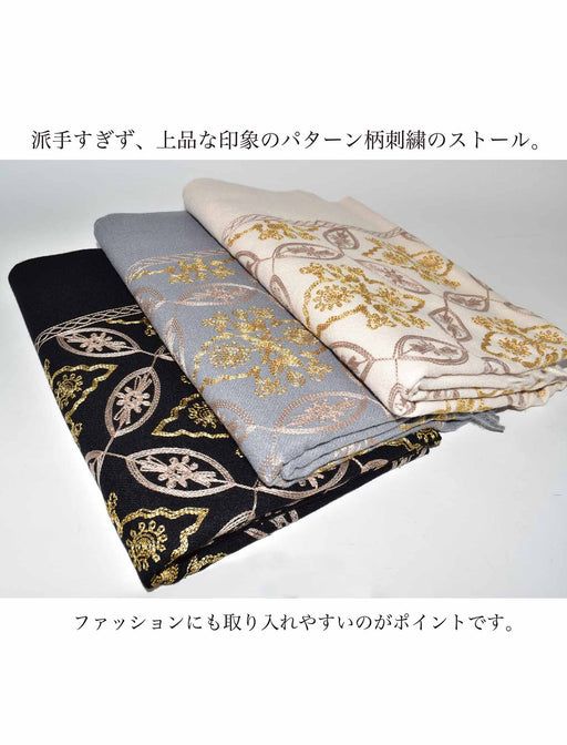 "顔周りを華やかに彩る” エレガントなパターン刺繍ストール。 肌寒い季節の必須アイテム!上品なパターン柄の刺繍が全体に施された、贅沢な大判ストールです。 シンプルな着こなしも、巻くだけでおしゃれにワンランク上に見せてくれます。