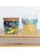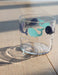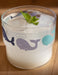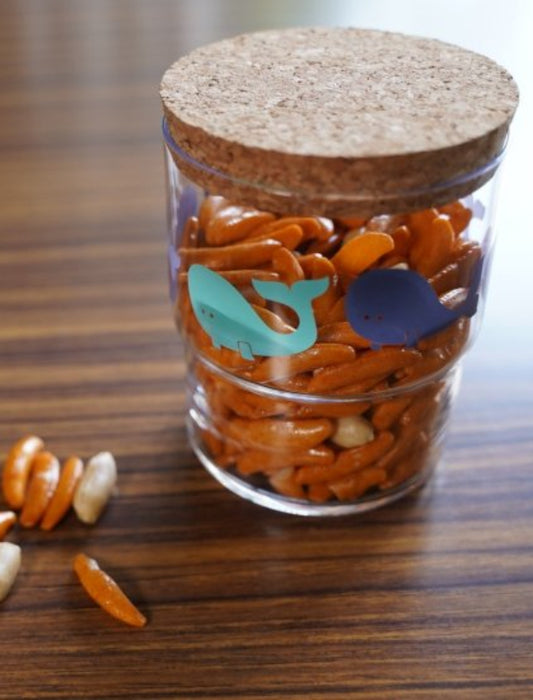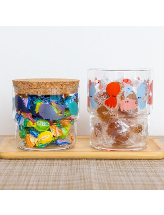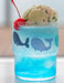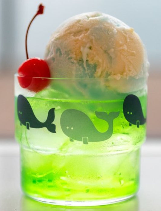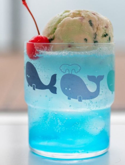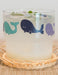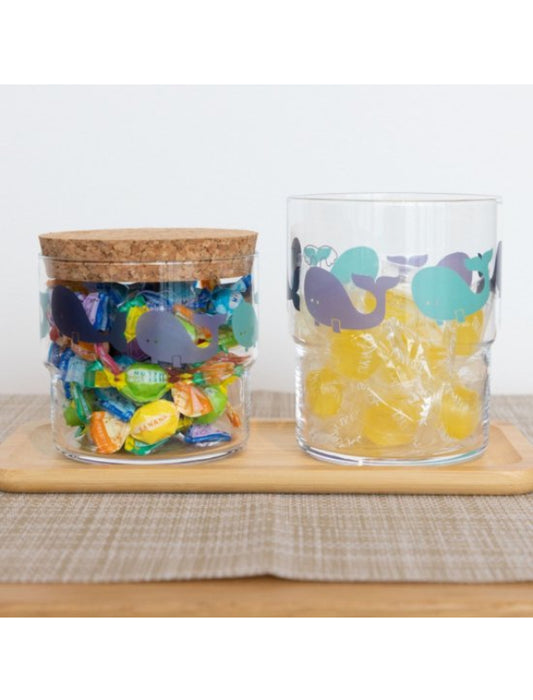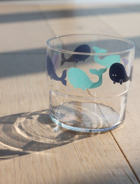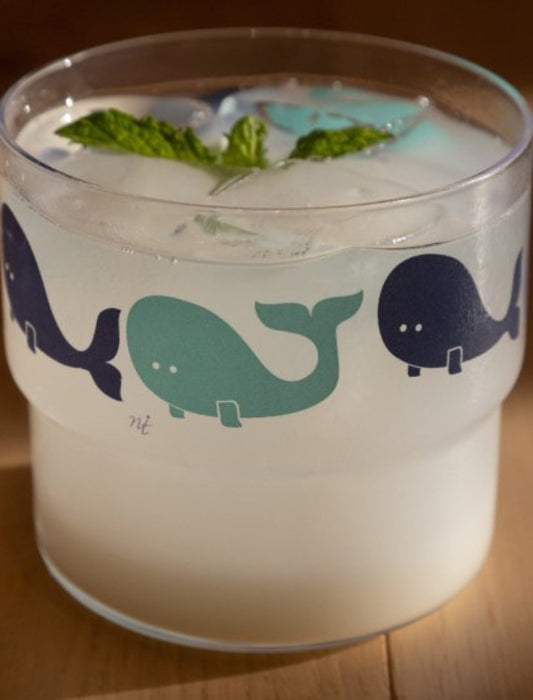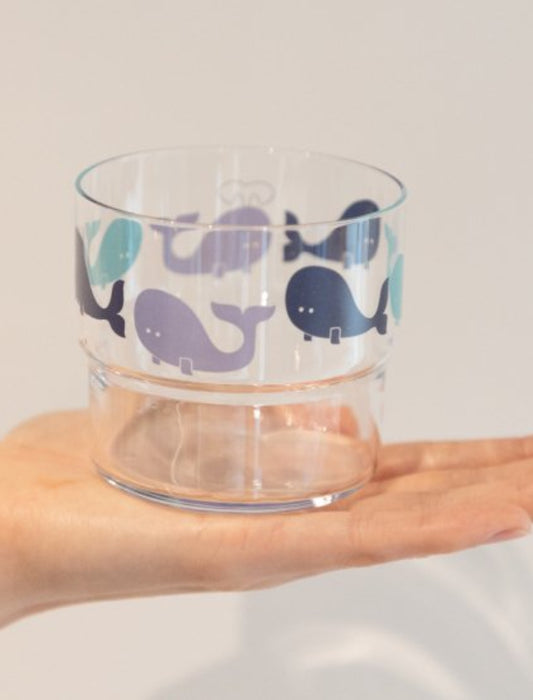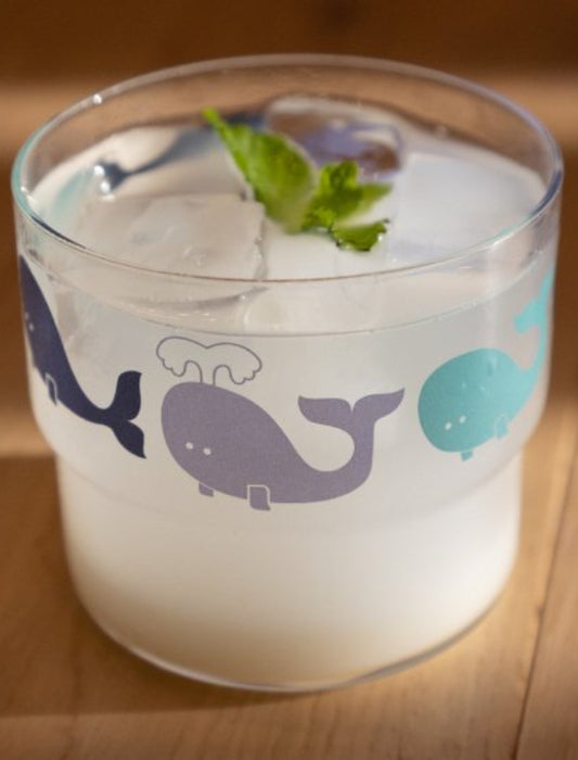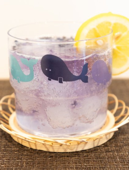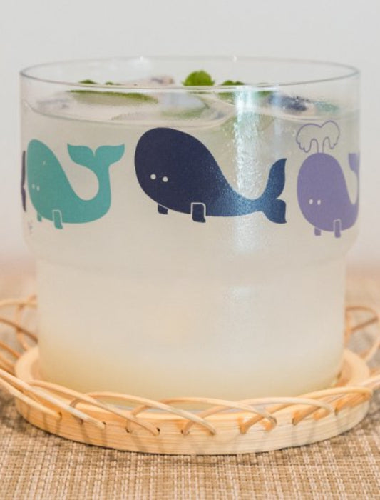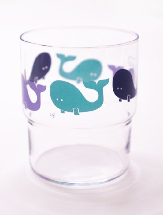 イラストレーターのタケヤマ・ノリヤさんが描いた、青色がベースのかわいいクジラのスタッキンググラス。