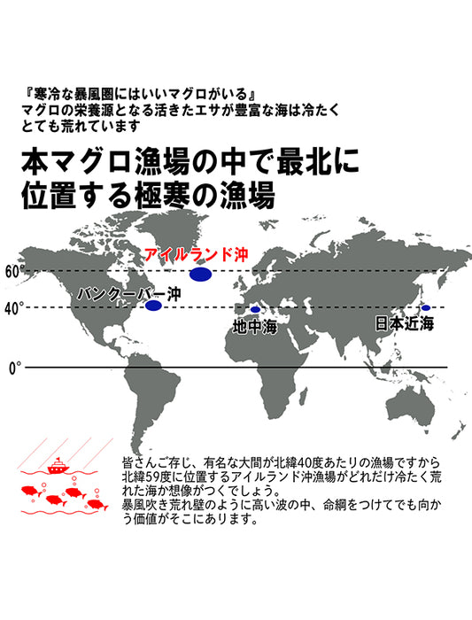 北緯59度、アイルランド沖の水温10℃前後の低温海水域で獲れたこだわりの天然マグロです。