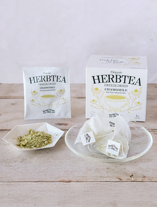 タイ北部・チェンライの自社農場で、農薬や化学肥料不使用の有機栽培で育てたカモミールを