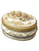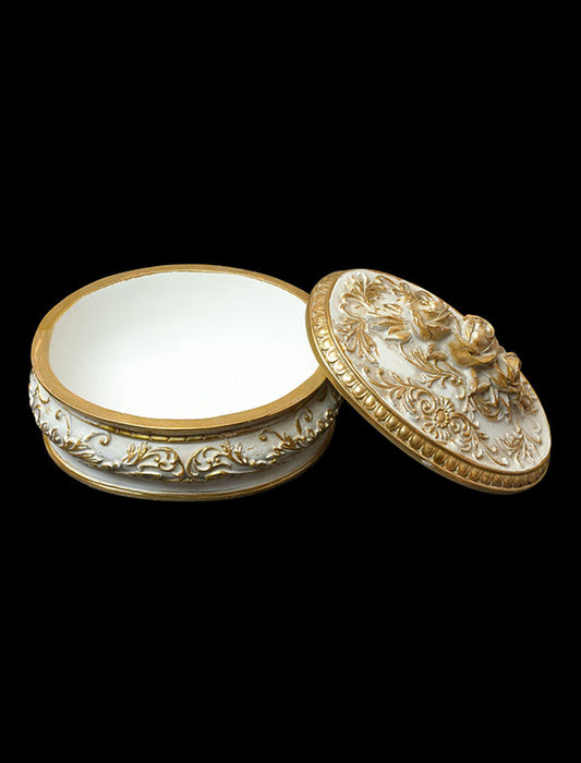 エレガントなゴールドローズの装飾が施された、クラシカルなオーバル型の小物入れ。