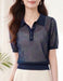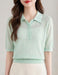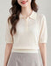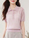 ほどよい透け感のリブ編みが、涼しげで上品な印象を与えるポロ襟ニット。